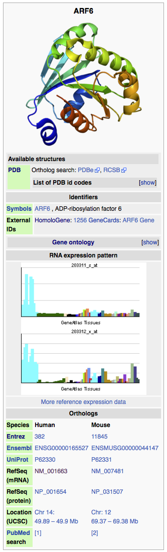 The first cut at the new template is {{infobox gene}}. If you put that on any article about a human gene, you ought to get the complete infobox for the article without any further ado. Poof! You can view it in action on this revision for ARF6. We haven’t rolled out the new template across all the articles yet, but hope to see that happen in the coming months. Remaining issues include: better error-handling in the template code, better ways to give users the ability to edit the associated data in wikidata, and updates to all of the code that produces gene wiki articles. If you want to help, chime in on the module:wikidata thread.
